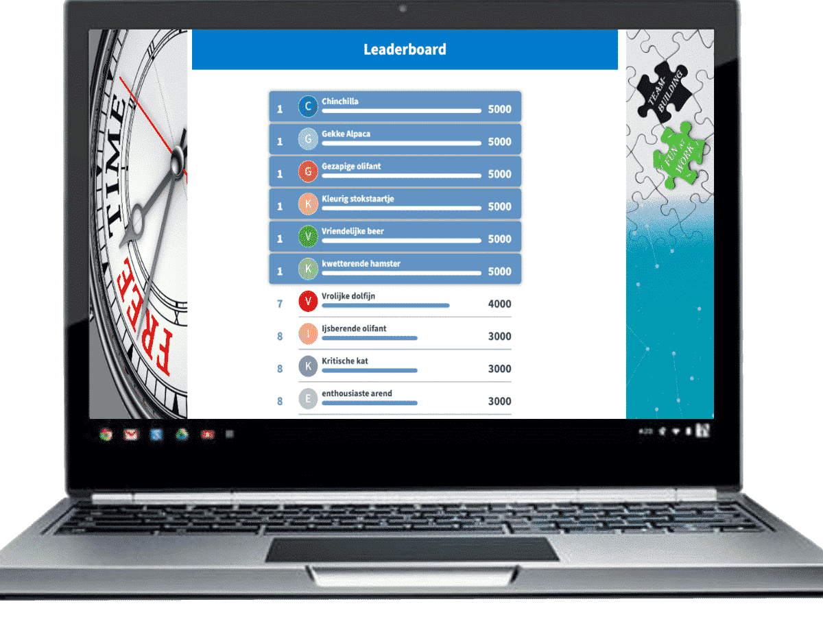 Dit is geen algemene kennisquiz maar een ludiek en leerrijk spel waarin je de collega’s zo goed mogelijk probeert in te schatten tijdens een online meeting of quiz ter plaatse. Alle deelnemers vullen vooraf een vragenlijst in en op basis daarvan wordt een quiz samengesteld. Waarom heeft Olivia de paus uitgenodigd naar een onbewoond eiland? Welke collega's doen auditie voor de rol van Monica in Friends? Wie is er vroeger nog buikdanseres geweest of Europees kampioen kunstrolschaatsen? Kort groepsoverleg en enkele opdrachten zorgen voor leuke afwisseling.