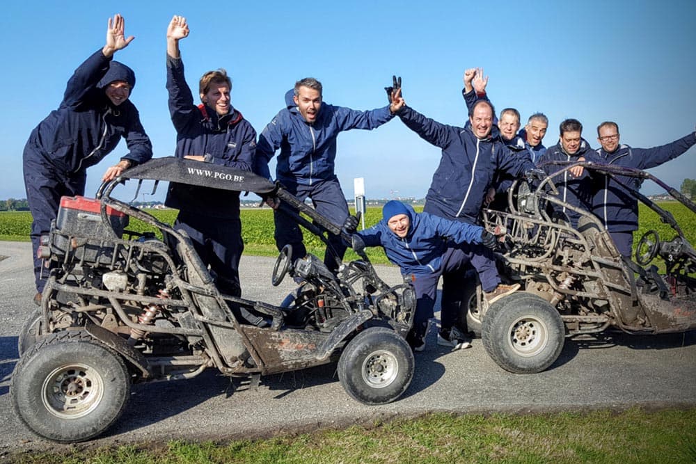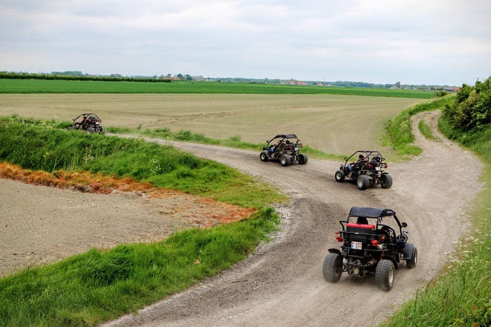 Stap in een buggy, scheur over uitdagende parcoursen en laat je volledig gaan. De tocht is gevarieerd (gravel, kasseien, aardewegen…). Er wordt gereden in onder meer Beveren, Haasdonk en Kallo. Geschikte outfit en beschermbril inbegrepen, ideaal voor een onvergetelijke teamervaring!