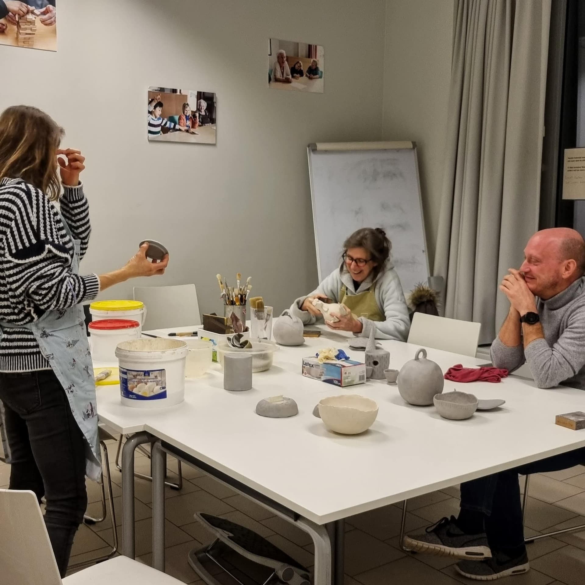 No prerequisites are necessary. Just come with the desire to relax and your good mood. We work with Belgian clay, which fires at 1250°. The personal piece is glazed with a transparent glaze. The collective piece remains unglazed.