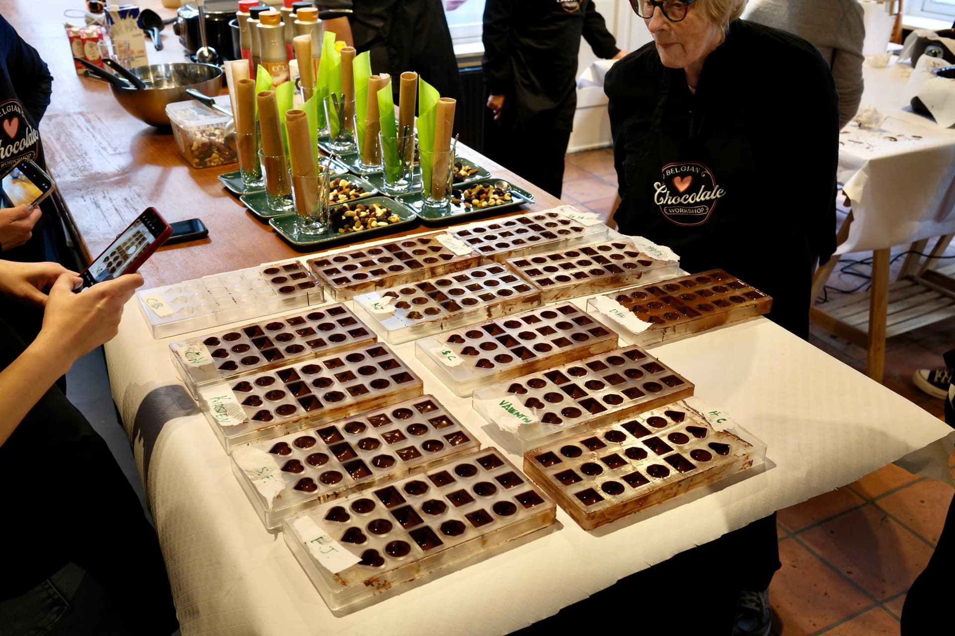 Teams van 2 of 3 worden gevormd, gevolgd door een korte uitleg over technieken voor het tempereren van chocolade voordat we aan het creatieve proces beginnen. De workshop is verdeeld in verschillende delen: te beginnen met het tempereren van de chocolade en vervolgens het vormen van de buitenste schalen van de pralines. Daarna werkt iedereen samen om chocoladegarnache voor de vulling te maken, mendiants te maken en tenslotte de pralineschalen te vullen en te sluiten. Terwijl we wachten tot de chocolade hard wordt, is er tijd om te ontspannen en te kletsen, terwijl we genieten van een van de beste warme chocolademelken ooit! Zodra de chocolade klaar is, gaan we verder met het ontvormen, proeven en verpakken van al je chocoladecreaties zodat je ze mee naar huis kunt nemen.